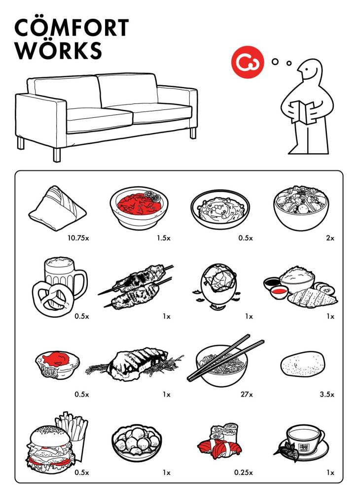 Diversity in Comfort Works forms the company to what it is now today. It’s difficult to disagree on foods! Each food representation was consulted by the individuals representing the country before they were illustrated. Comfort Works’ products make up almost 60% to cater IKEA products – hence the IKEA man. The t-shirt design won the competition and was printed and produced for the company retreat.