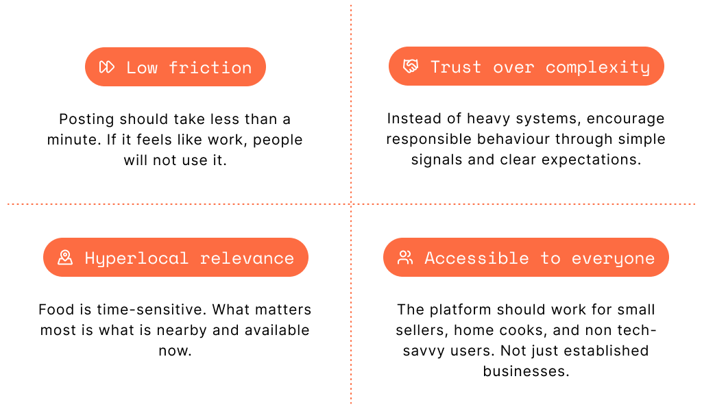 To design a low-friction platform that enables individuals and small food businesses to share surplus food within their local communities. The challenge is to balance accessibility and trust, making it easy enough for anyone to contribute, while ensuring users feel safe and confident engaging with the platform.