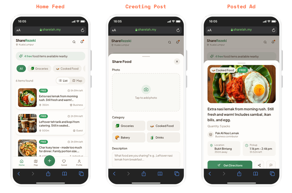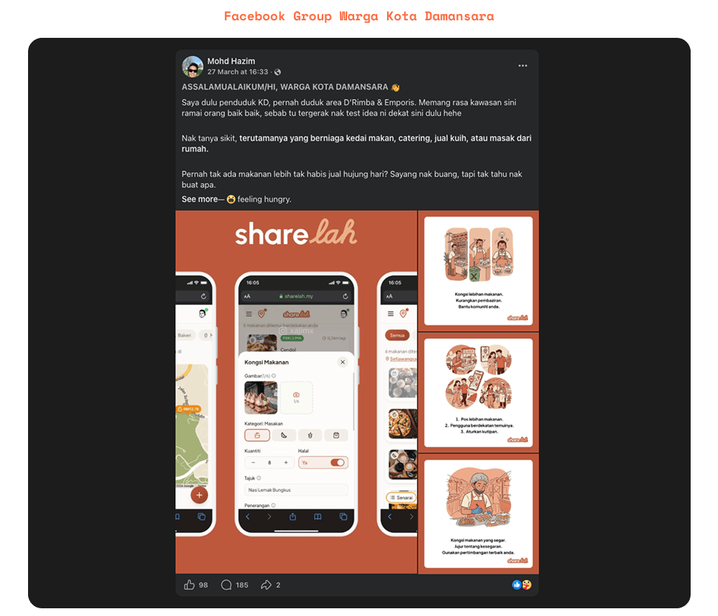 Early validation was done through community outreach and conversations with potential users. To see if ShareLah was a real need or just a “nice idea,” I went where the community lives: Facebook Groups and WhatsApp. I didn’t just look at data; I looked at conversations: