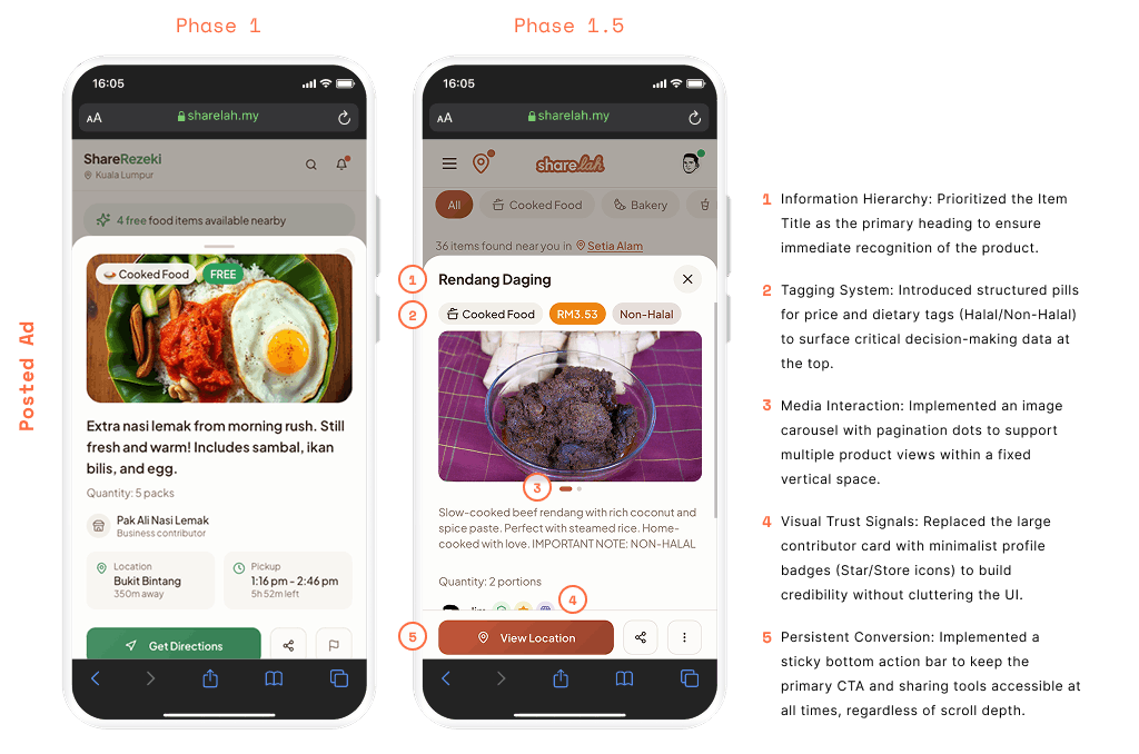 After defining the core flows, I focused on simplifying interactions and improving scan-ability, especially for time-sensitive decisions like food pickup.