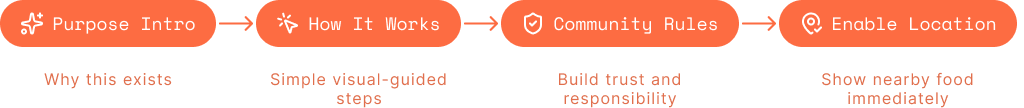 New users are introduced to the purpose of the platform, community expectations, and location access in a clear and simple way.